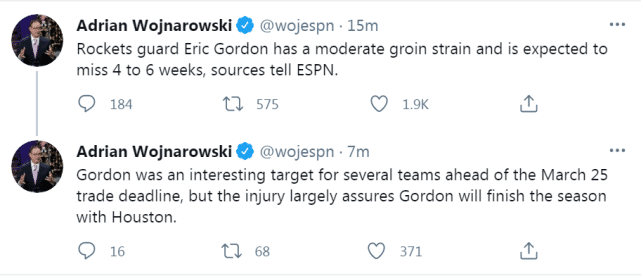 戈登在昨天对国王的比赛中意外受伤,ESPN名记沃纳罗斯基给出的最新消息是戈登确诊为右腹股沟中度拉伤,预计要缺席4-6周的时间,由于这次伤病的突然出现,原本在火箭交易名单上的戈登,本赛季很可能会留在火箭。
