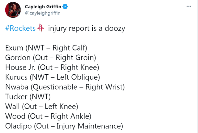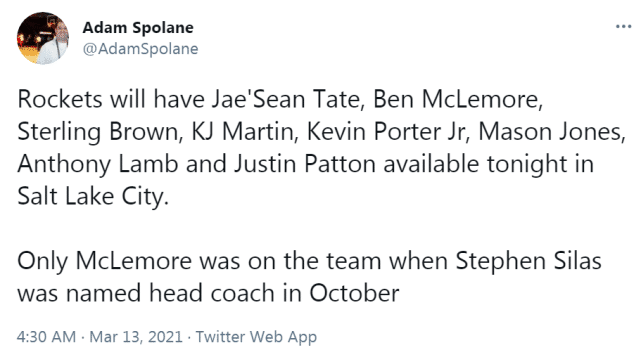 火箭记者斯珀兰列出了火箭本场比赛确定能打的8名球员: 泰特、麦克勒莫、布朗、马丁、波特、琼斯、兰姆和帕顿。去年10月份,赛拉斯被任命为火箭主帅时,这8名球员中只有麦克勒莫当时在球队的阵容里。
