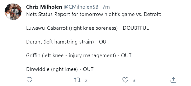 24直播网讯北京时间3月13日,篮网官方公布了最新的伤病名单,杜兰特(左腿筋拉伤)、格里芬(左膝伤病管理)、丁威迪(右膝伤病)继续缺阵,卢瓦乌-卡巴罗特(右膝酸痛)大概率不打。篮网的下一个对手是底特律活塞,这意味着格里芬将无缘对阵老东家。
