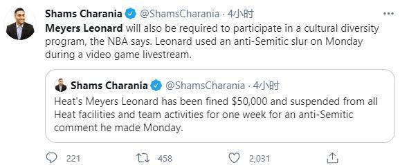 联盟总裁亚当萧华发表声明“梅耶斯-莱昂纳德的言论充满伤害,不可原谅。这种冒犯性的话语在NBA和我们这个社会中没有容身之地。昨天他已经与相关官员沟通去更好认识自己言论的影响。我们认为他已然十分悔恨。我们与他进行了更深入的对话,告诉了他这种言论是不可原谅的,并希望他可以践行联盟的核心价值观——平等、宽容、包容以及尊重。”