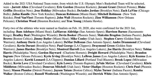 附:美国男篮集训57人名单(新入选15人+最初42人)