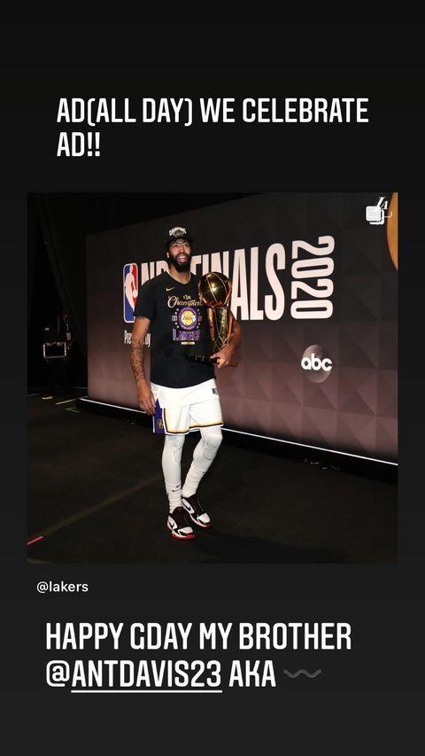 浓眉的缺阵,让湖人的战斗力大受影响,詹姆斯的压力也增加不少。这一天是浓眉28岁的生日,詹姆斯也在社媒上祝福队友生日快乐。他配上了一张浓眉抱着总冠军奖杯的照片,并写道:“AD(ALL DAY,一整天)我们祝福AD!生日快乐,我的兄弟@安东尼-戴维斯!”AD是浓眉的英文名缩写,詹姆斯也巧妙地用来作为ALL DAY的缩写,祝福浓眉生日一整天都要快快乐乐。
