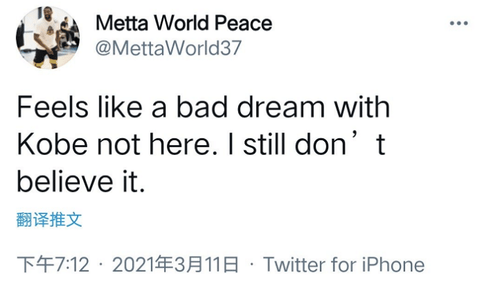 24直播网3月12日讯 近日前NBA球星阿泰斯特的言论吸引了不少人的关注,他在社交媒体上追忆可以,称:“科比不在这,这感觉就像是至今都不敢相信的噩梦。”