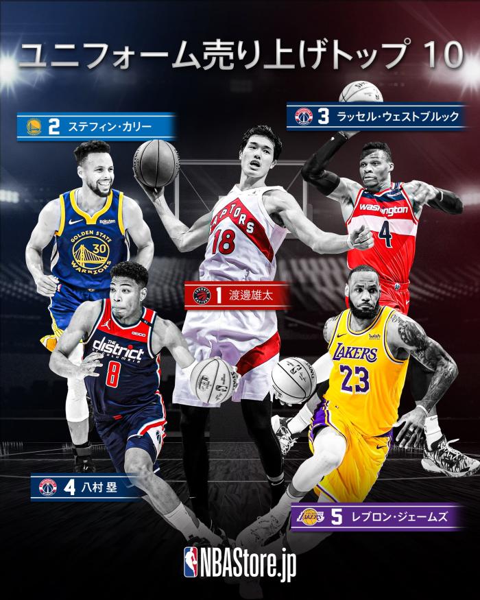 威少作为暴力流的集大成者,球衣销量在同级别的MVP球员中始终稳压一筹。而在球鞋排行榜上,威少一样是佼佼者,甚至在2019年成为了全球卖鞋王。而本赛季威斯布鲁克转会到华盛顿奇才后,成为了另一位日本籍球员八村塁的队友,这也对于提高他在日本的球衣销量是最重要的原因。而猛龙队没有这种MVP级别的队友,威斯布鲁克自然也成为了日本市场最畅销的主队队友,而去年威斯布鲁克在日本的销量连前五都没有进入。4.八村塁(华盛顿奇才)