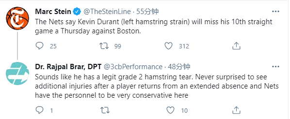 对于杜兰特的腿筋受伤情况,专业医生分析:他应该遭遇了2级腿筋撕裂。当一名球员长期缺阵回归后,再次经历附加伤病的情形从不少见,好在篮网拥有足够的人员配置从而可以在此事上格外谨慎,最多需要6-8周的恢复期。