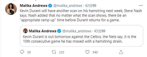 32岁的杜兰特腿筋伤势如何?本来篮网方面认为杜兰特缺席两场比赛就能复出,结果他将连续缺席10场比赛,并将在下周接受腿筋伤势的复查,目前还没有杜兰特的具体复出时间表;纳什表示篮网确定杜兰特的腿筋伤势与跟腱无关,目前杜兰特已经参加投篮训练,不过他还不能参加全场5对5训练。