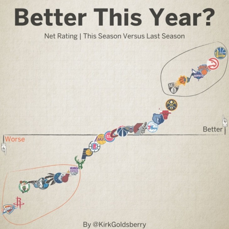 Kirk Goldsberry还特意圈出了“变得更好”和“变得更差”的一些球队代表:勇士、老鹰、尼克斯、黄蜂、爵士、太阳、篮网成为“变得更好”的显著代表;雷霆、火箭、凯尔特人、魔术、独行侠、猛龙、森林狼、热火、国王则是“变得更差”的典型。