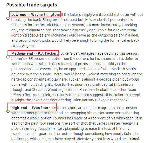 交易市场上,湖人能争取到哪些新援?CBS列出的人选依次是埃灵顿、PJ-塔克和伊万-富尼耶。其中,埃灵顿算是初级目标,如果湖人不愿对阵容进行大的调整,埃灵顿可能是最佳选择。效力活塞的这个赛季,他的三分命中率高达41.4%。湖人用麦金尼+次轮签的报价,应该可以足以说服活塞送上这位射手。2014-15赛季,埃灵顿曾经效力过湖人。