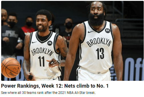 24直播网3月9日讯 NBA官方公布最新一期球队实力榜,篮网排名升到第一,爵士掉到第三,湖人掉到第六,快船排名也继续下降;太阳强势逆袭升到第二位,勇士跌出前十,火箭深陷谷底已经很难出来了。