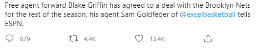 24直播网讯北京时间3月8日,距离NBA全明星正赛开始仅剩下不到1个小时,NBA再次传出了消息,根据名记报道,NBA球星格里芬加盟篮网队,格里芬此前和活塞达成了买断协议,放弃大约1300万美元,对格里芬感兴趣的球队很多,其中包括篮网、湖人、勇士等,最终格里芬选择加盟篮网,格里芬将在篮网打替补,担任小球阵容的中锋!