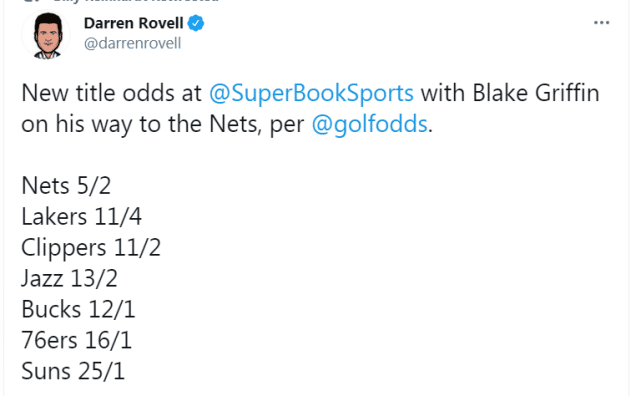 新赛季开始后的很长一段时间,湖人的夺冠赔率都排在联盟第一,而格里芬交易后,总冠军最新赔率显示,篮网已经超过湖人,升至榜首。目前,总冠军赔率排名前七位的球队依次是篮网(2赔5)、湖人(4赔11)、快船(2赔11)、爵士(2赔13)、雄鹿(1赔12)、费城(1赔16)和太阳(1赔25)。