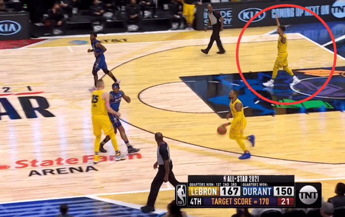 直接回到利拉德最后一球,按照规则前三节领先一方率先得到170分的队伍取胜。此时,詹姆斯队已经拿到167分,只差3分。结果最后一球,利拉德后场持球推进。而当利拉德还在运球的时候,库里甚至已经张开双臂,对着虚拟观众席做挥手再见的手势。