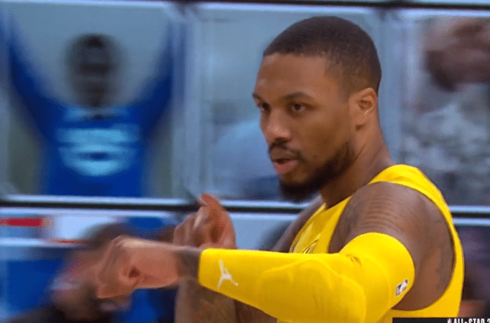 虽然不是标准意义上的绝杀,但同样也是终结比赛的一球。利拉德随后张开双臂庆祝胜利,随后指了指自己的手腕,做出了标志性的庆祝动作。