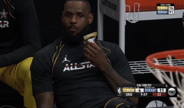第三节的比赛开始后,詹姆斯队这边更变了首发阵容,利拉德顶替詹姆斯首发出场,随后库兹马更新社交媒体:把冰袋绑上吧,老铁,这一节的比赛詹姆斯并没有上场,因为湖人这边浓眉受伤,詹姆斯也是单核带队,比较累,所以下半场的比赛詹姆斯休息,詹姆斯并未首发出战,转播镜头给到了在替补席上的詹姆斯,在在板凳席上啃起了零食。这一节的比赛字母哥延续着自己出色的发挥,他前16投全部命中轰下了35分,这一节的比赛末段,两队再互飚三分球,米切尔压哨三分命中,詹姆斯队第三节46:45净胜杜兰特1分。