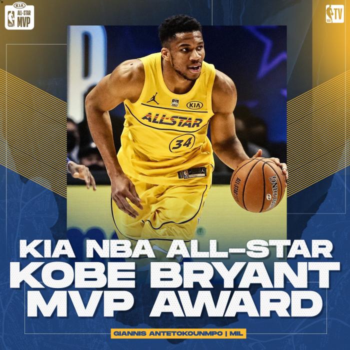 24直播网讯 北京时间3月8日,詹姆斯队170-150轻松大胜杜兰特队,字母哥全场出战19分钟16投16中其中三分3中3,高效轰下35分5篮板3助攻,力压库里当选今年全明星赛科比-布莱恩特MVP;字母哥职业生涯首次夺得全明星MVP,成为全明赛最大赢家。