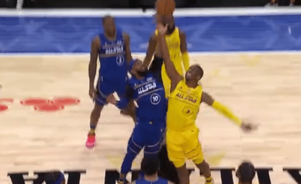 全明星正赛库里是替补才第一次参加的,他在第二节初期代表杜兰特队和詹姆斯队的保罗跳球,两人的身高都不高,所以关注度很好,大家满满的期待,最终保罗跳球成功,他兴奋的庆祝,同样庆祝的还有场边詹姆斯队的库里,他就好像自己跳球成功了一样,而康利跳球失败,“小个对决”失利了。