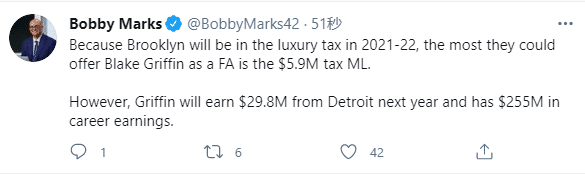据薪资专家报道,篮网本赛季要缴纳高昂奢侈税,格里芬明年可以从活塞领取2980万美元,职业生涯收入将高达2.55亿美元。