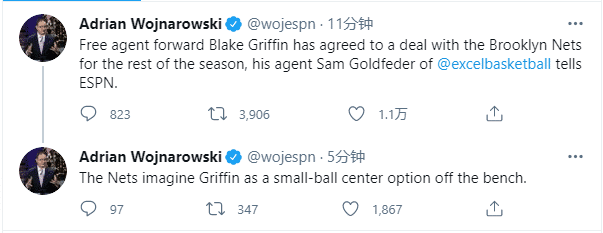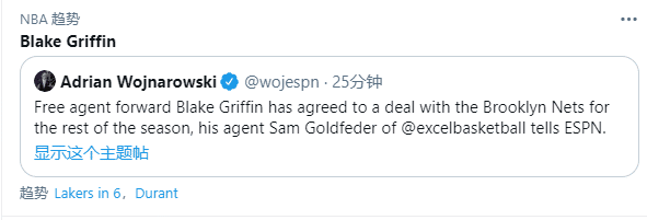 24直播网讯 北京时间3月8日,在NBA亚特兰大全明星赛这一天,格里芬下家终于确定下来,先是shams报道篮网预计签约格里芬,然后ESPN名记报道格里芬已经同意签约篮网,格里芬的经纪人证实了这一重磅新闻,目前只差篮网正式官宣。