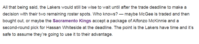 另一位湖人跟队记者Christian Rivas指出,目前来看,湖人最明智的选择还是耐心等待,不要急于出手。他们还有两个阵容名额。或许麦基会被交易后买断,让湖人重新拥有签回他的机会;或许国王在交易截止日时会愿意接受麦金尼+1个次轮签换怀特塞德的报价。这样一来,湖人的内线问题有望得到解决。