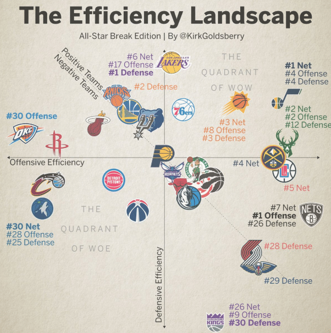 湖人的防守一直都很出色,在这份榜单上可以说是一枝独秀,进攻端湖人确实相对一般,这也和他们的场均得分111.4分联盟第20分相差不大。因为进攻排名联盟中下游,所以直接拉低了湖人的净效率。