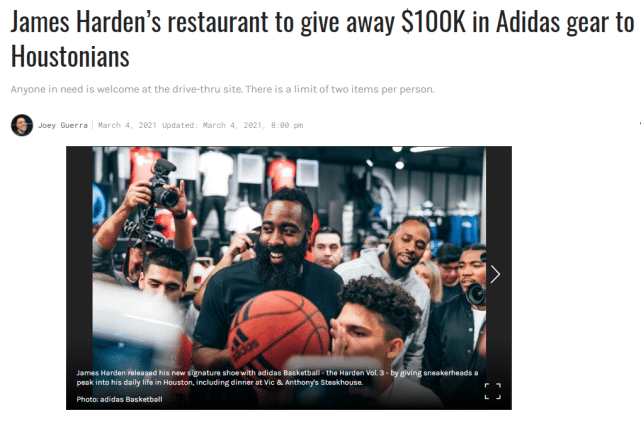 24直播网讯 北京时间3月5日,来自休斯顿媒体的报道,哈登在休斯顿经营的餐厅将和某运动品牌合作,为休斯顿捐赠价值10万美元的衣物鞋子装备。报道该新闻的记者评论道:虽然他已经离开了休斯顿,但他的心一直都在。