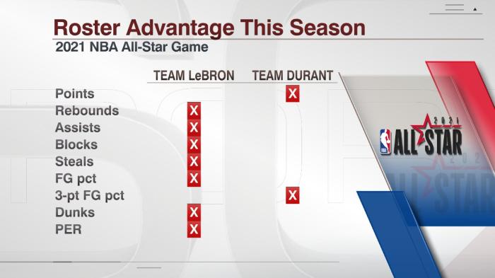 詹姆斯和杜兰特都已组建属于自己的全明星队,相比之下,詹姆斯队多项数据力压杜兰特队占有一定的优势,在ESPN九大数据对比中,詹姆斯队篮板、助攻、盖帽等数据都强于杜兰特队,而杜兰特队得分和三分命中率占优;在总薪资方面,詹姆斯队3.57亿美元,也比杜兰特队(2.87亿美元)更豪华。
