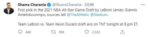 24直播网讯 北京时间3月5日,NBA第一阶段常规赛最后一个比赛日,也是两大全明星队长选人组队的日子,据名记shams透露,西部队长詹姆斯首选雄鹿球星字母哥,这就是联盟票王的首选;可惜杜兰特只参加直播选人,因伤无缘全明星正赛。