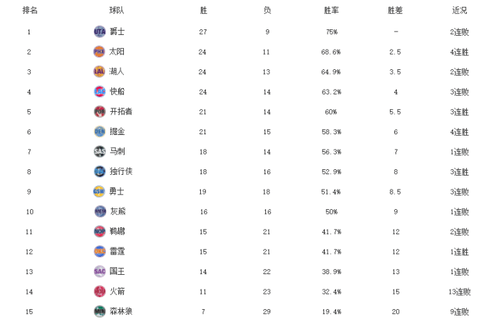 24直播网3月5日讯 今天结束的NBA常规赛一共有10支西部球队出战,其中包括了快船被奇才逆转、掘金击败步行者、灰熊遗憾输给雄鹿、鹈鹕不敌热火、雷霆险胜马刺、国王被开拓者逆转击败、太阳大胜没有库里和追梦格林的勇士。接下来我们就来看看NBA西部的最新排名: