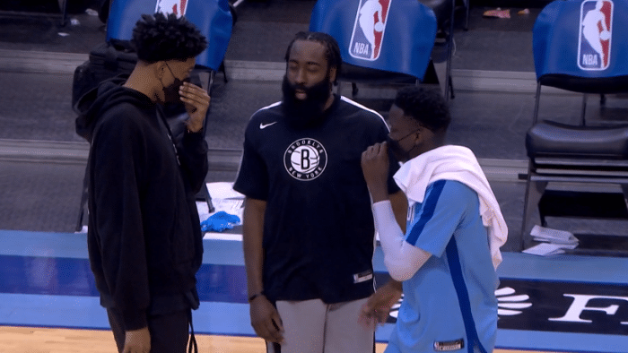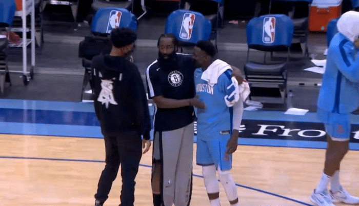 哈登还和奥拉迪波相互拥抱,伍德站在一旁,三人有说有笑聊起来;哈登拥抱火箭助教以及多位前队友,这画面让昔日的一切小恩怨都化解了。