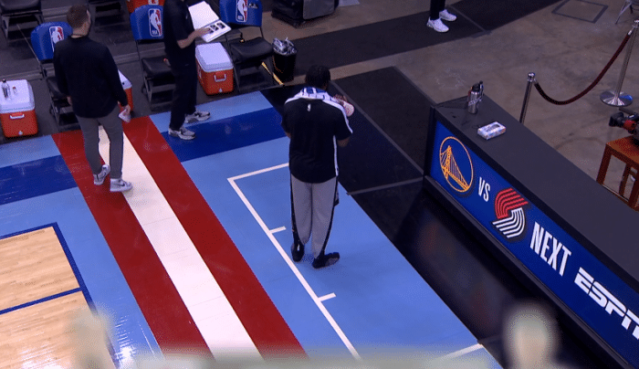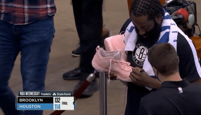 众球员都离场之后,哈登脱掉骚粉色的原味战靴,掏出来鞋垫(让工作人员帮自己先拿着),然后亲笔签名把这双球鞋送给现场的球迷,而哈登穿着袜子走回更衣室。