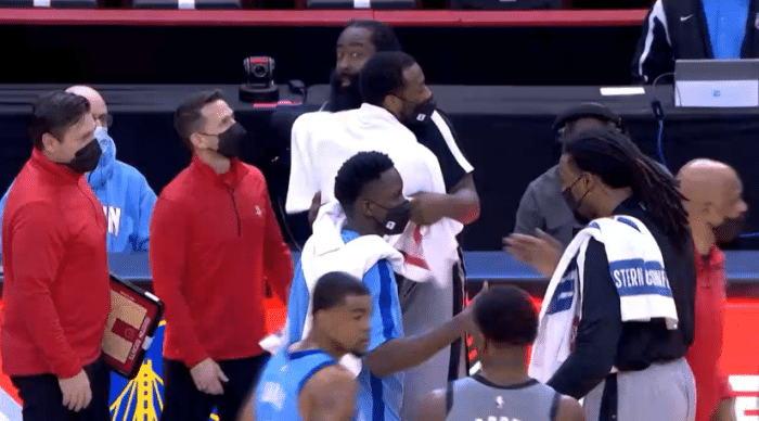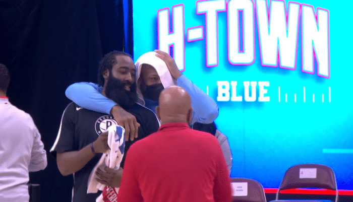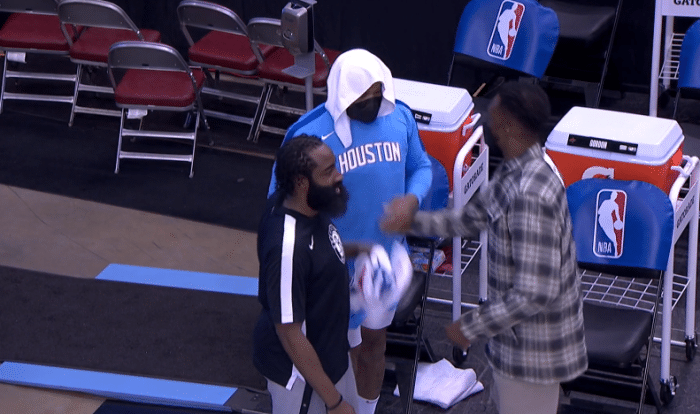 赛后哈登主动跑到火箭替补席,先是拥抱火箭助教,中途遇到沃尔,两人紧紧拥抱相互致敬;然后哈登用拥抱多位前队友,泰特、琼斯等人都来昔日老大哥拥抱;紧接着哈登找到塔克,两人有说有笑十分亲密,哈登还摸了摸塔克的脑袋,这两兄弟之间的关系太好了,杰夫-格林也过来和塔克打招呼。
