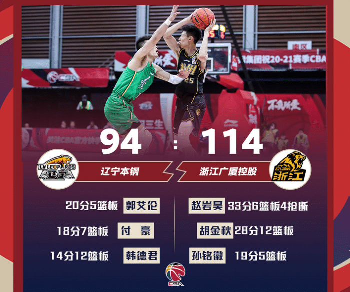 24直播网3月4日讯 今天晚上CBA常规赛焦点战辽篮和广厦的强强对话结束了争夺,最终广厦114-94击败辽篮,这场比赛广厦掌握着主动权,他们首节得到38分,单节领先17分,上半场领先19分,分差也一度拉大到20+,虽然下半场辽篮在郭艾伦的带领下将差距缩小到10分,不过广厦的整体气势和状态更好,他们没有给辽篮翻盘的机会,成功拿下了胜利。胡金秋28分12篮板,孙铭徽19分5篮板5助攻4抢断和赵岩昊33分6篮板4抢断是广厦赢球的最大功臣。郭艾伦(20分5篮板)CBA生涯抢断数来到了645次,超越了辽篮主帅杨鸣(644次),升至CBA历史抢断榜第18位。