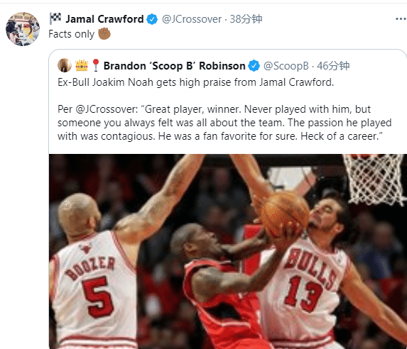 对于诺阿退役,昔日超级第六人贾马尔-克劳福德盛赞诺阿:伟大的球员,赢家!从来没有和他一起打过比赛,但你会一直觉得他是球队的核心。他打比赛的激情是有感染力的,肯定是球迷的最爱;干得不错!