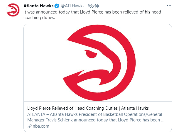 随后老鹰篮球运营总裁兼总经理Travis Schlenk发表了声明,他表示:在此,我们要感谢皮尔斯的工作和他对老鹰以及亚特兰大的贡献。皮尔斯和他的妻子都是了不起的人,他们对这座城市产生了积极的影响。我们对球队的成绩有很高的期望,希望能通过现在的改变来让球队在下半程获得更好的战绩。