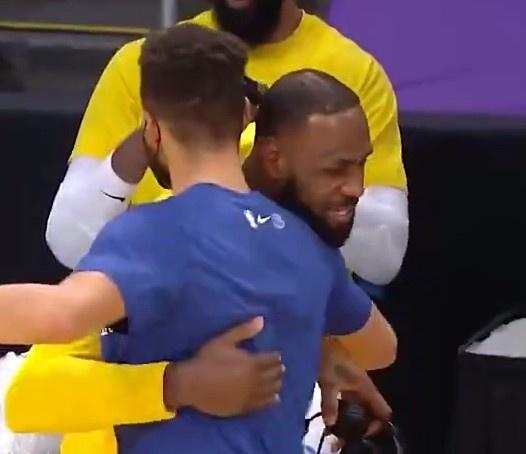 赛后出现温馨的一幕,湖人球星詹姆斯正在场边接受媒体的采访,当看到库里从眼前走过时,詹姆斯立马摘下耳机中断了赛后采访和库里进行拥抱寒暄示意,两位超巨惺惺相惜,场上对决互有胜负,但也尊重彼此所创造的荣誉取得的成绩。