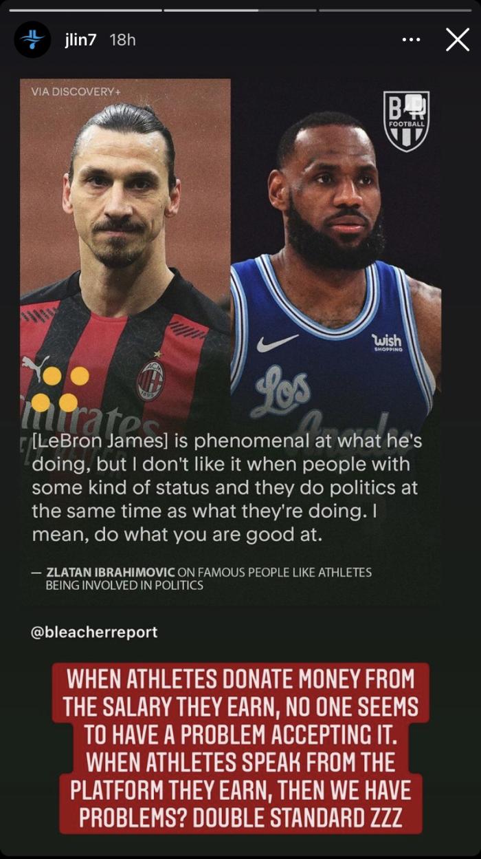 24直播网北京时间2月27日/讯 此前AC米兰前锋伊布谈论詹姆斯不该谈论政治,最好自己最擅长的事情就好了;如今林书豪声援詹姆斯,更新社交媒体并且说了一番很直接的话:运动员捐钱时没人有异议。