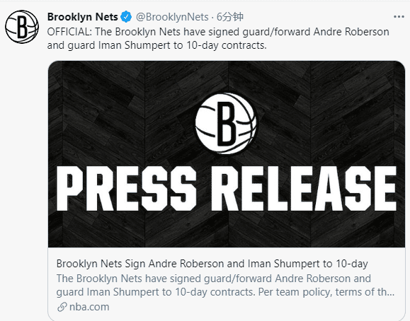 24直播网2月27日讯 北京时间2月27日,篮网正式官宣连签两人,用10天短合同签下香波特和罗伯森;此前香波特和罗伯森都在对阵国王赛后被裁掉,度过48小时澄清期(认领期)之后,篮网重新签下他俩,10天短合同保持阵容的灵活性。