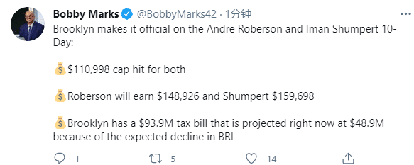 据薪资专家bobby marks报道,罗伯森十天短合同的薪水是14.9万美元,香波特薪水大约是16万美元,目前篮网阵容总共需要缴纳4890万美元的奢侈税;篮网花31万重签两人,对于罗伯森和香波特来说,他俩有10天的机会证明自己,证明自己能为篮网提供一些支持。