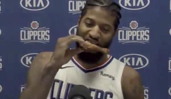 快船复仇灰熊赛后,30岁乔治接受采访时,一边吃东西一边回答记者的问题,甚至拿起鸡腿大口吃起来,在采访现场当众大口吃肉,看来乔治真的累饿了,当然也可能是赢球心情好,想吃就吃了;快船记者调侃,快船赢球后乔治狂吃炸鸡,这就是所有人都需要的那种最纯粹的幸福。