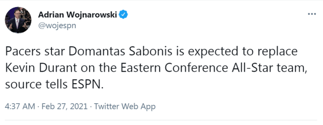 24直播网讯北京时间2月27日,篮网官方宣布,凯文-杜兰特因左腿筋伤势需要更多恢复时间,将缺席本赛季的全明星正赛。随后,NBA官方宣布,步行者球星小萨博尼斯将顶替受伤的杜兰特,入选东部全明星阵容,杜兰特的全明星首发位置,由绿军的塔图姆替代。