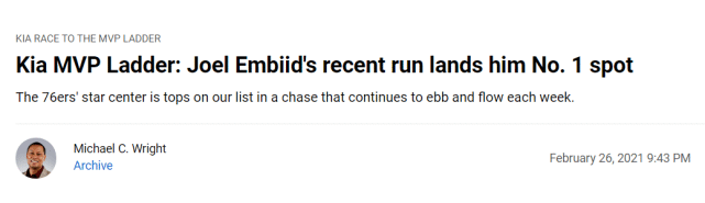 24直播网讯 北京时间2月27日,NBA官方公布了第五期的MVP排行榜。恩比德超越詹姆斯,升至榜单的第一位。詹姆斯、约基奇、库里、利拉德分列二至五位。上周排名升至第十的哈登,本周依然停留在第十位,引起一些争议。毕竟,哈登率领篮网打出8连胜,个人也当选了上周的东部周最佳球员。