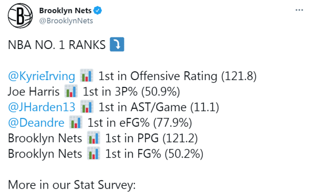 球队数据方面,篮网场均得到121.2分,进攻效率118.2,两项都排名联盟第一;投篮命中率50.2%,有效率命中率58.9%,两项命中率也都排名联盟第一。