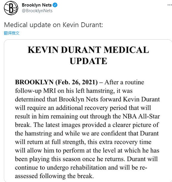 杜兰特腿筋伤势加重吗?篮网官方公布最新的核磁检查结果:最新的检查结果让我们更加了解杜兰特的腿筋伤势,我们非常自信杜兰特会完全痊愈并复出,但额外的恢复期会让他在复出时拥有和本赛季此前一样的出色状态。他将会继续接受恢复治疗,并在全明星之后接受复查。