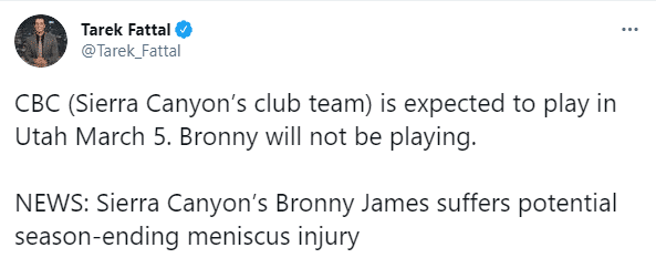 24直播网北京时间2月26日/讯詹姆斯大儿子布朗尼伤势最新情况曝光,据名记Tarek Fattal报道,CBC(加州篮球俱乐部)计划于3月6日在犹他开始比赛,布朗尼所在的塞拉峡谷高中就是CBC俱乐部的一支球队,布朗尼将不会参加比赛,因半月板伤势很可能赛季报销。