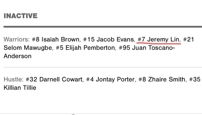 24直播网2月26日讯 今天发展联盟继续进行,圣克鲁兹勇士以116-111击败孟菲斯疾行者,继续保持连胜势头。国内球迷们的关注点依旧是在林书豪的身上,非常可惜今天的比赛林书豪虽然在热身的时候出场投篮,但是依旧因为背部伤病而缺席比赛,这也是本赛季林书豪第5次缺席比赛,连续4场无缘比赛了。