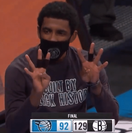 而到了比赛结束之后,欧文伸手双手,做出了“8”的样子,意思是篮网已经取得8连胜,确实非常霸气。