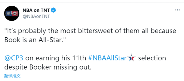 保罗表示:“这可能是我职业生涯最苦乐参半的一次入选全明星的经历,因为布克是一个全明星,这并不是说要剥夺任何一个入选全明星球员的资格,但是我们太阳队,是跟着布克一直向前,他知道这一点,我们也知道这一点。”