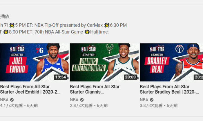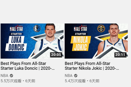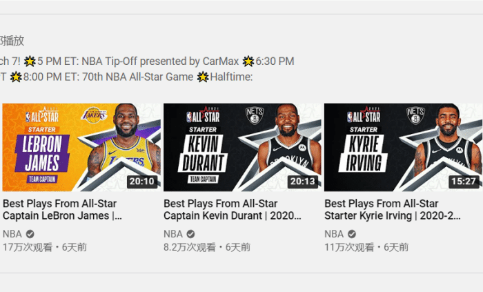 NBA官方选取的十大首发的集锦基本都是20分钟左右,因此在观看选择上,球迷更多都会纯粹依据兴趣。从视频播放量来看,库里的集锦已经来到50万次观看,遥遥领先其他的9名全明星首发球员。