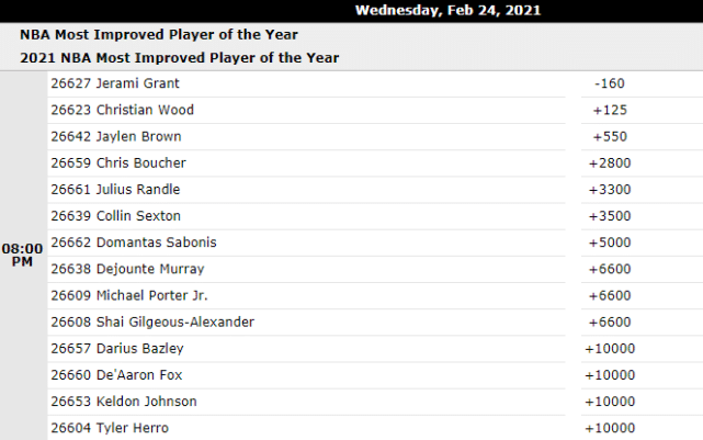 目前,这一奖项赔率领跑的是活塞前锋格兰特。他当选进步最快球员的赔率是-160,排名第二的伍德是+125,位居第三的杰伦-布朗是+550。格兰特加盟活塞后,战术地位提升,他的数据也明显上涨。伍德也很有竞争力,只是他因伤缺战多场,需要在复出后有更好的表现,才有机会赶超格兰特。布朗也是有力竞争者,他进步明显,已经生涯首次入选全明星。