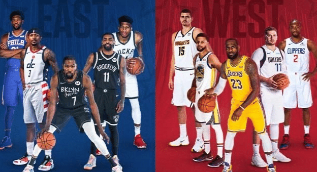 东部首发阵容:杜兰特(队长)、字母哥、比尔、欧文和恩比德;